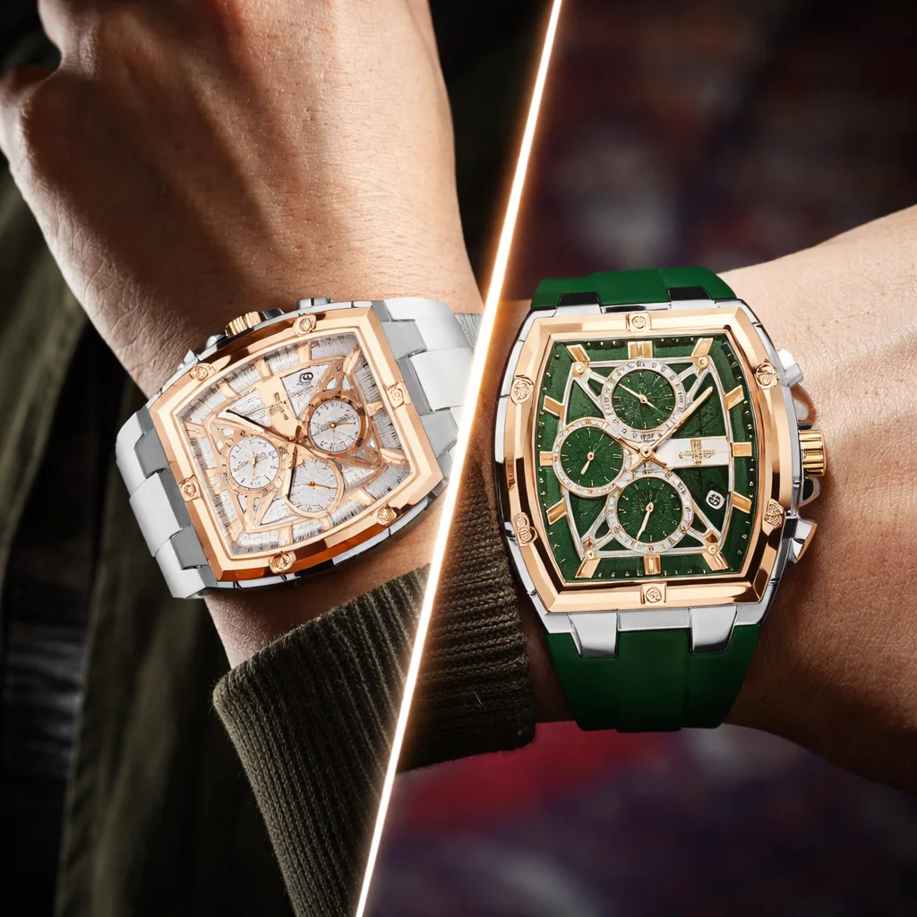 مزيج أنيق من الألوان الفخمة يمنح الساعة حضوراً قوياً على المعصم.